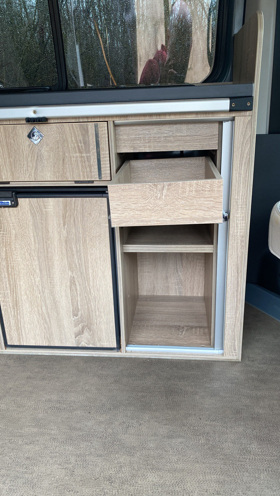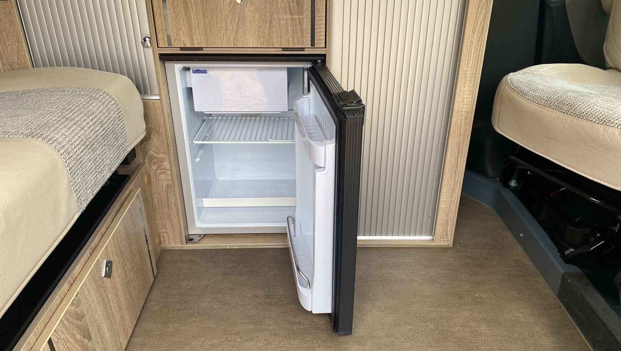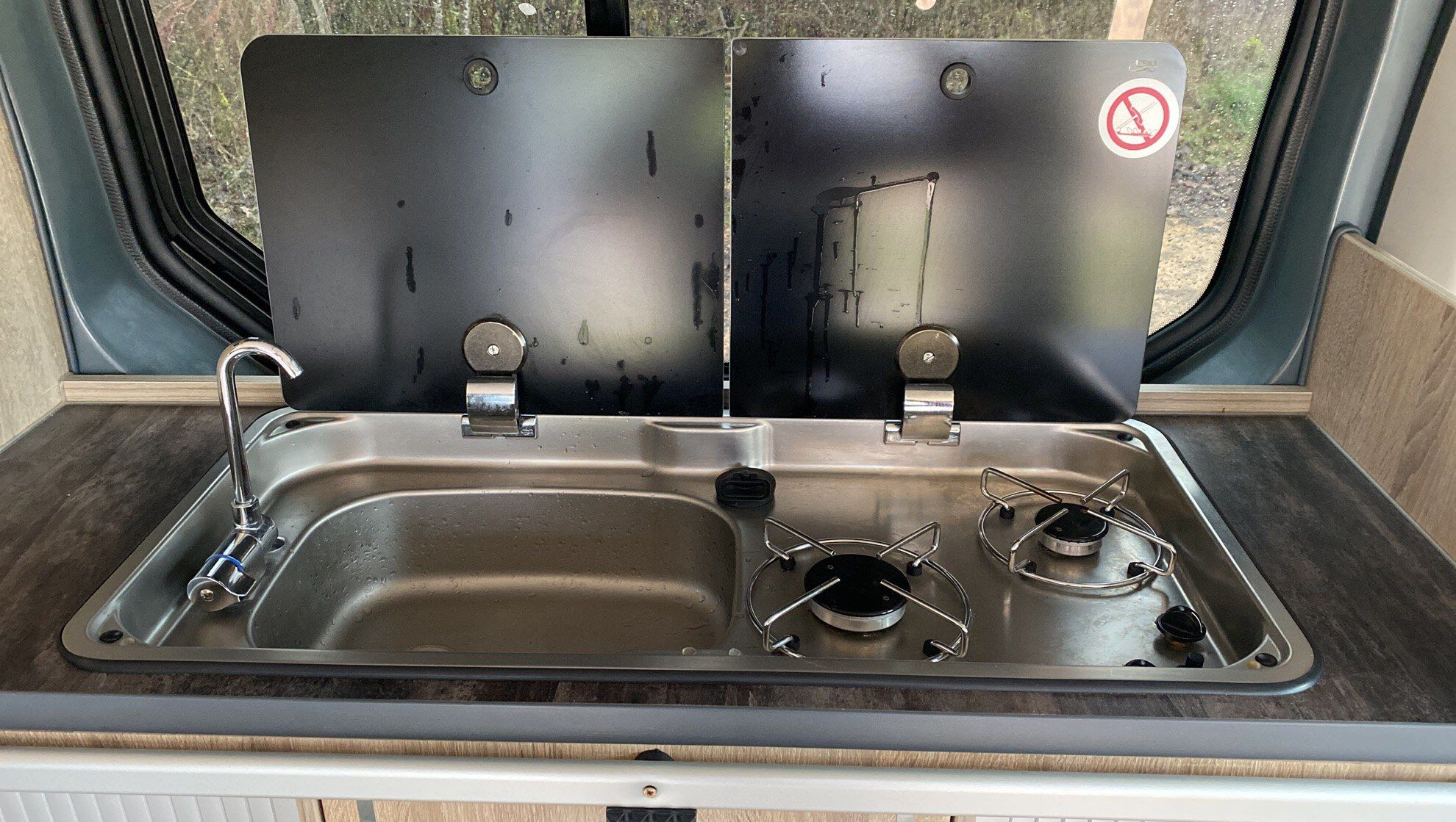 Kitchenette équipée évier feux gaz dans compartiment étanche, réfrigérateur